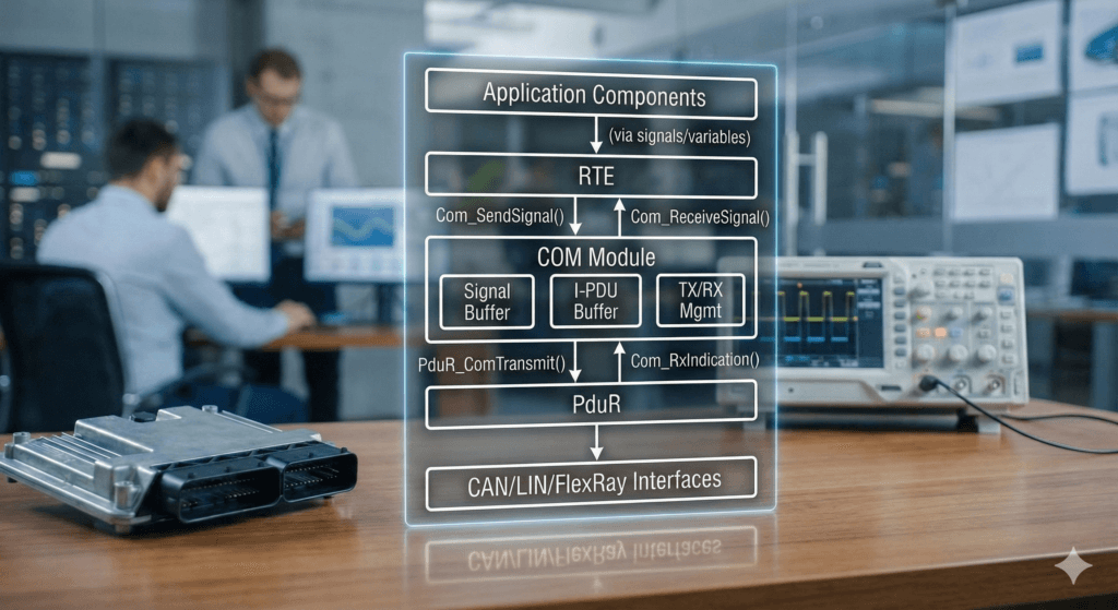 COM is a BSW (Basic Software) module located in the Services Layer that provides an abstraction between application software (which works with signals) and the communication bus system (which works with Protocol Data Units – PDUs).