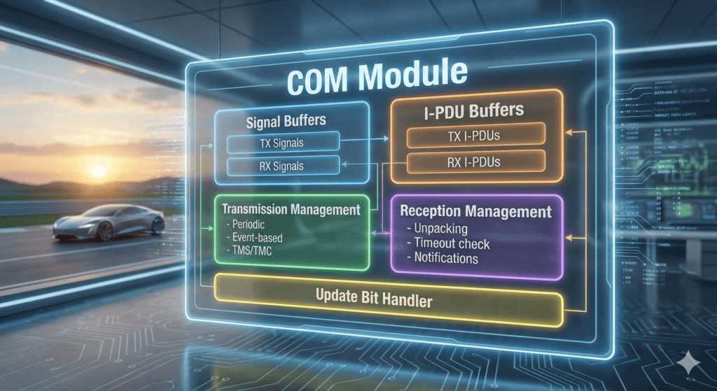 The COM (Communication) Module is a standardized software component in AUTOSAR Classic Platform that manages all signal-level communication between ECUs over the CAN bus network.